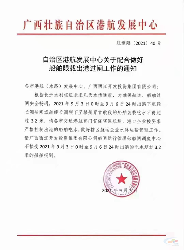 2021年9月3日0時(shí)至9月6日24時(shí)出港下航經(jīng)長(zhǎng)洲船閘或航經(jīng)長(zhǎng)洲壩下至梧州界首航段的船舶裝載吃水不得超過(guò)3.2米。......