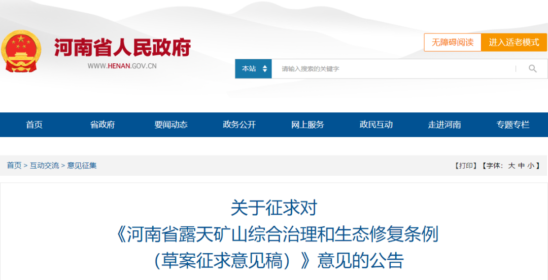 近日,河南省人民政府、河南省司法廳就《河南省露天礦山綜合治理和生態(tài)修復(fù)條例(草案征求意見稿)》(以下簡(jiǎn)稱《條例》)向有關(guān)單位和各界人士征求意見。